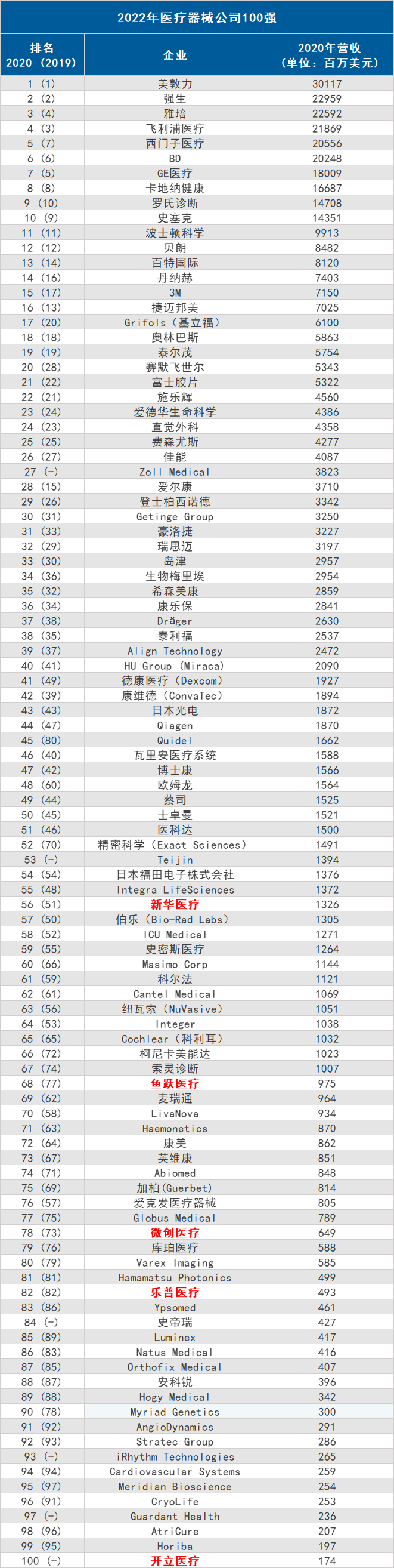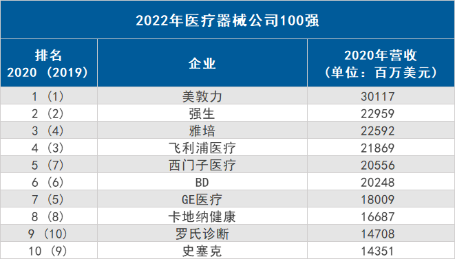 近日,國(guó)外權(quán)威的第三方網(wǎng)站QMED最新發(fā)布了《2022年醫(yī)療器械企業(yè)百?gòu)?qiáng)榜單》,該榜單根據(jù)2020財(cái)年的營(yíng)收狀況對(duì)全球醫(yī)療器械公司進(jìn)行了排名。