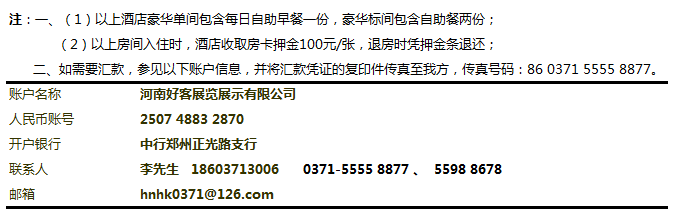 4、 提供會務公司發(fā)票(開票項目:會務費)和酒店發(fā)票(開票項目:住宿費),如有需開增值稅專票,請將開票信息傳真到 0371-55558877 或者以電子郵件形式發(fā)送到訂房郵箱中。
