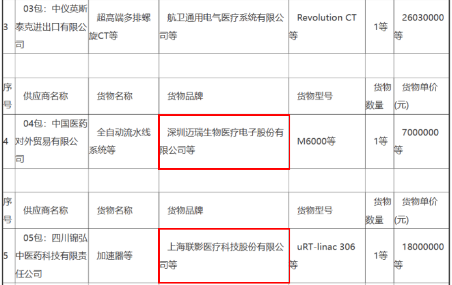 主要標的信息顯示,01包核心產(chǎn)品無創(chuàng)呼吸機、04包核心產(chǎn)品全自動流水線系統(tǒng),均由邁瑞提供;05包核心產(chǎn)品加速器,由聯(lián)影提供。貨物型號、數(shù)量及單價如下: