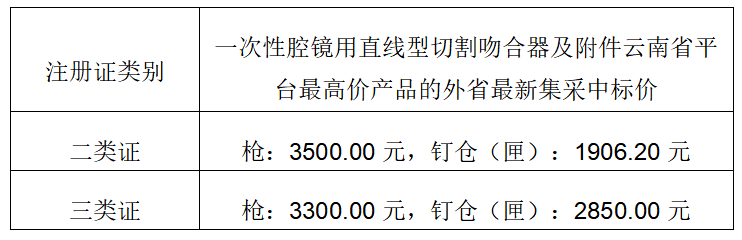 其中,“一次性腔鏡用直線型切割吻合器及附件”二類、三類注冊證產(chǎn)品申報價,分別不得高于目前云南省藥品集中采購平臺集采掛網(wǎng)二類、三類注冊證最高價產(chǎn)品的外省最新集采中標(biāo)價(區(qū)分槍和釘)。