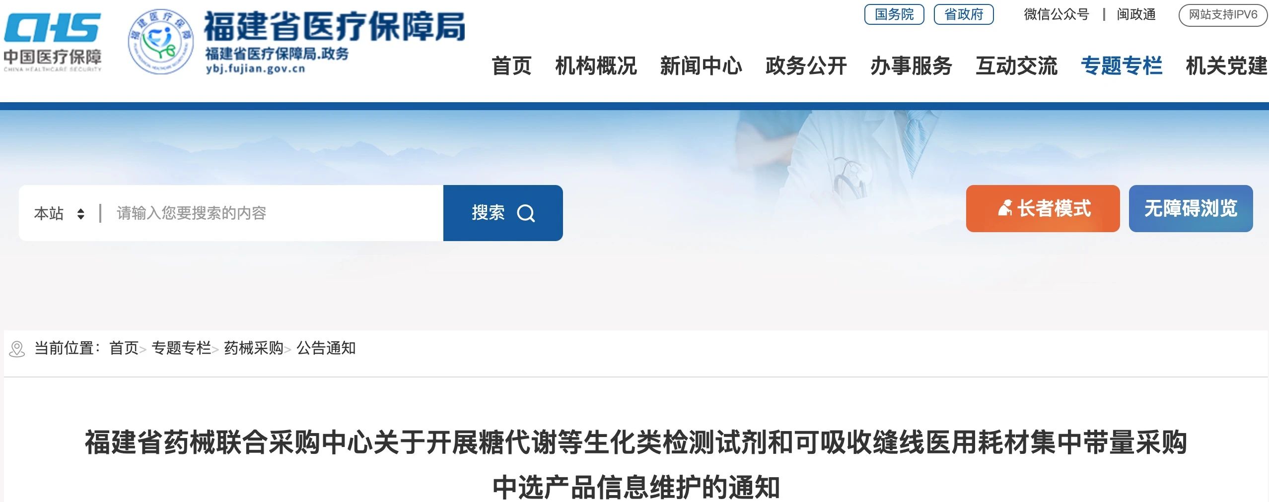 3月18日,福建醫(yī)保局發(fā)布《福建省藥械聯(lián)合采購中心關(guān)于開展糖代謝等生化類檢測(cè)試劑和可吸收縫線醫(yī)用耗材集中帶量采購中選產(chǎn)品信息維護(hù)的通知》(簡(jiǎn)稱《通知》)。