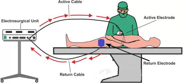 高頻電刀手術中,電流是從刀筆流入人體,然后在負極板流出。如下圖