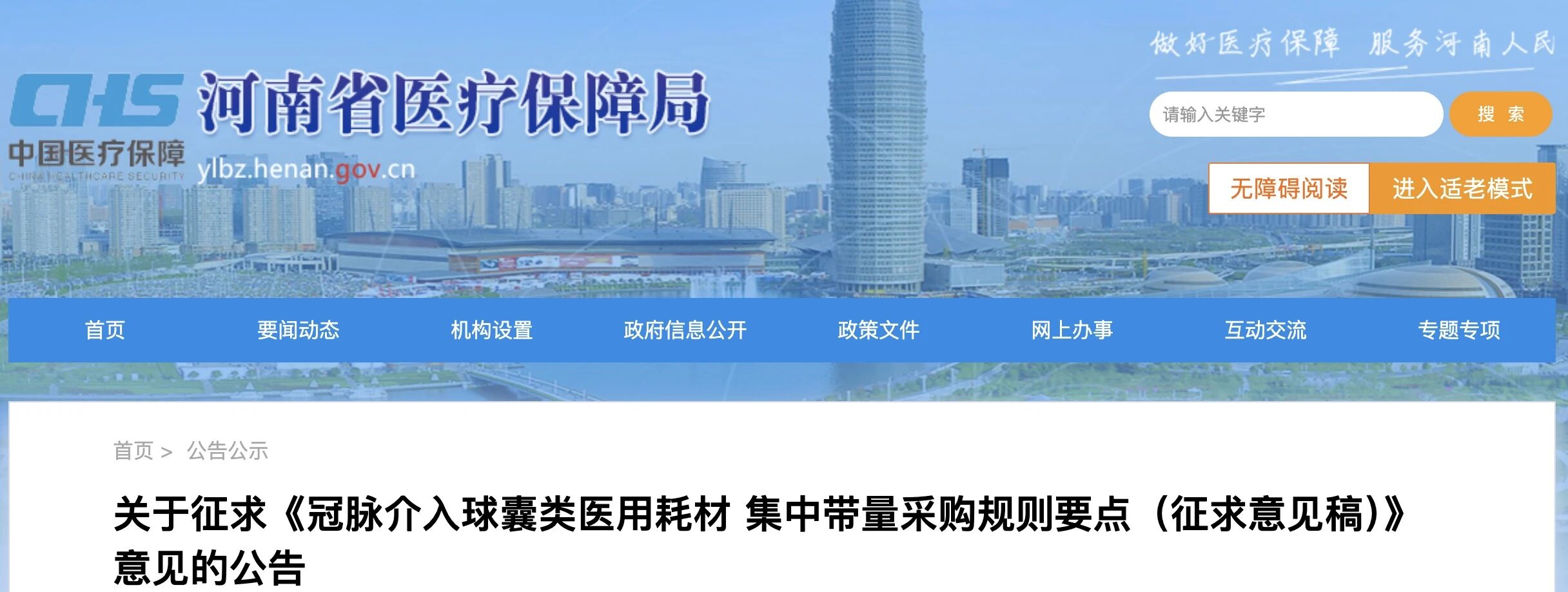 9月11日,河南醫(yī)保局發(fā)布《冠脈介入球囊類醫(yī)用耗材 集中帶量采購(gòu)規(guī)則要點(diǎn)(征求意見(jiàn)稿)》(完整見(jiàn)文末),意見(jiàn)征求截止時(shí)間為9月15日18時(shí)。