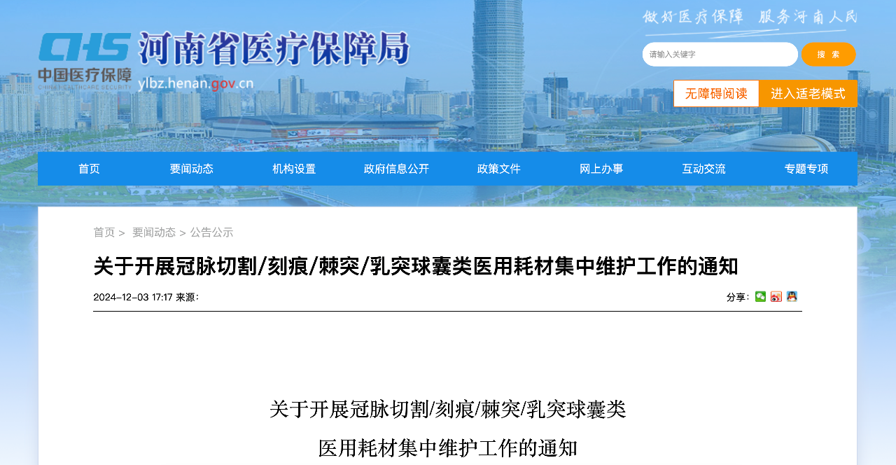 12月3日,河南省醫(yī)保局發(fā)布《關(guān)于開展冠脈切割/刻痕/棘突/乳突球囊類醫(yī)用耗材集中維護(hù)工作的通知》,產(chǎn)品信息集中維護(hù)時(shí)間為:2024年12月5日至12月8日。