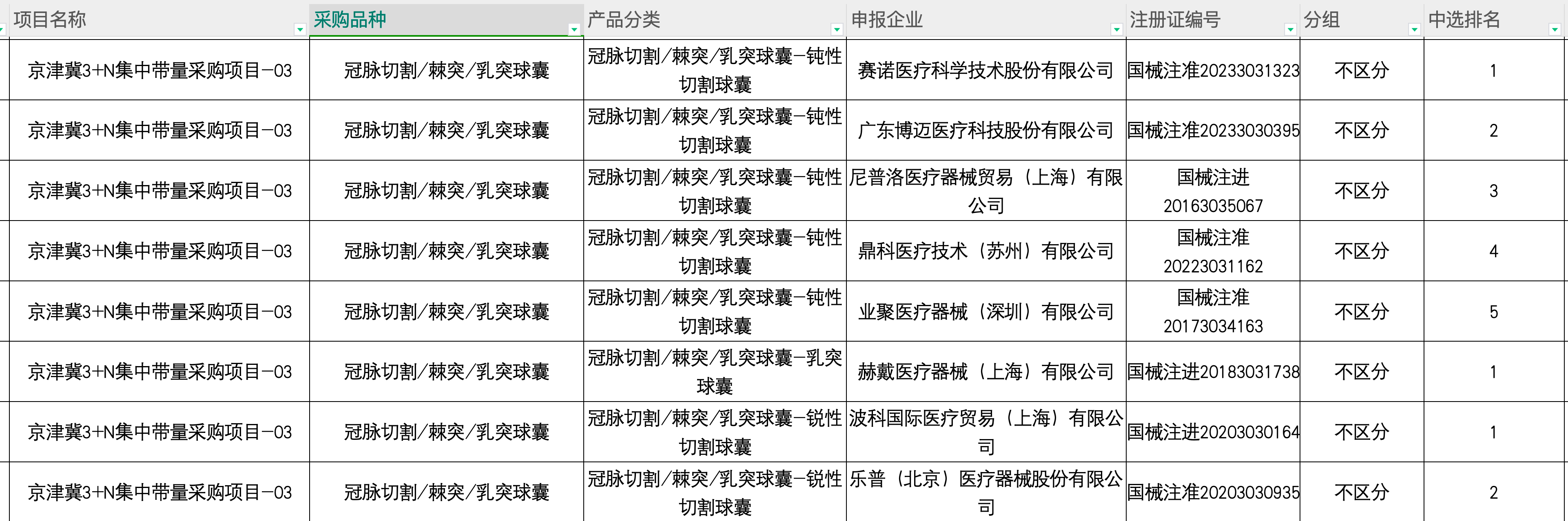 梳理發(fā)現(xiàn),相關(guān)品類僅在2023年京津冀“3+N”聯(lián)盟28種耗材集采中出現(xiàn)過,采購(gòu)品種為冠脈切割/棘突/乳突球囊,帶量中選價(jià)在1198-4978元之間,涉及地區(qū)有安徽、新疆生產(chǎn)建設(shè)兵團(tuán)、廣西、貴州、江西、遼寧、青海、三明、西藏、新疆、云南,采購(gòu)周期為2年。