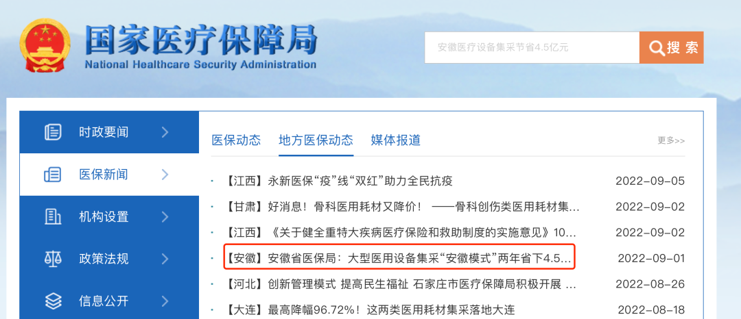近日,國家醫(yī)保局官網(wǎng)轉(zhuǎn)載人民網(wǎng)文章《安徽省醫(yī)保局:大型醫(yī)用設(shè)備集采“安徽模式”兩年省下4.5億元》,介紹安徽省大型設(shè)備集采結(jié)果和成效。