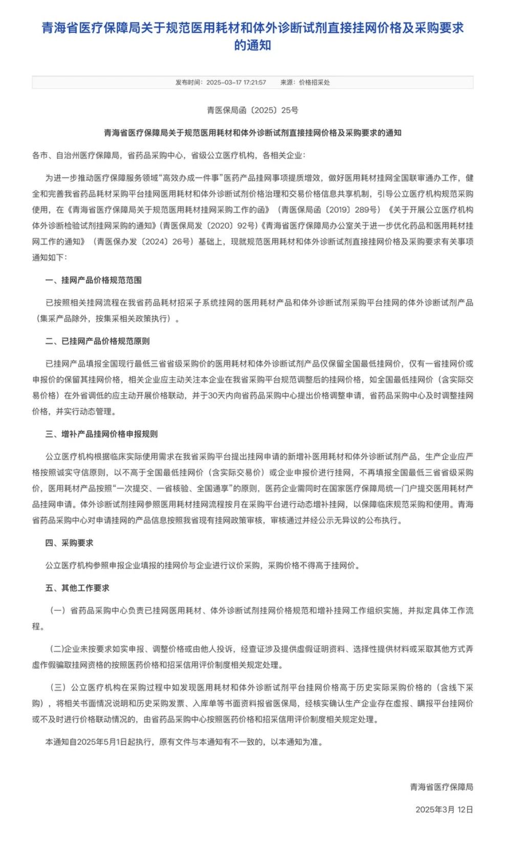 3月17日,青海省醫(yī)保局發(fā)布《關(guān)于規(guī)范醫(yī)用耗材和體外診斷試劑直接掛網(wǎng)價(jià)格及采購(gòu)要求的通知》,對(duì)醫(yī)用耗材和體外診斷試劑直接掛網(wǎng)價(jià)格及采購(gòu)要求進(jìn)行調(diào)整。