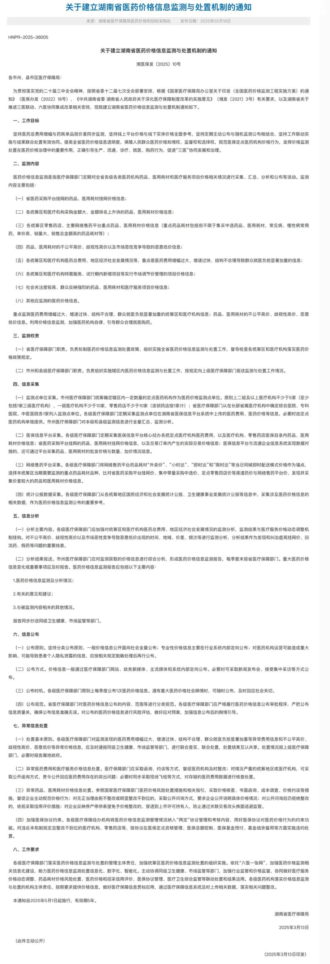 同樣在5月1日開(kāi)始執(zhí)行的,還有湖南省醫(yī)保局發(fā)布的《關(guān)于建立湖南省醫(yī)藥價(jià)格信息監(jiān)測(cè)與處置機(jī)制的通知》。文件提出,重點(diǎn)監(jiān)測(cè)醫(yī)藥費(fèi)用增幅過(guò)大、增速過(guò)快、結(jié)構(gòu)不合理、群眾就醫(yī)負(fù)擔(dān)顯著加重的統(tǒng)籌區(qū)和醫(yī)療機(jī)構(gòu)信息;藥品、醫(yī)用耗材的不公平高價(jià)、歧視性高價(jià)、惡意低價(jià)信息。利用價(jià)格信息監(jiān)測(cè),加強(qiáng)醫(yī)藥機(jī)構(gòu)自律、引導(dǎo)群眾合理就醫(yī)購(gòu)藥。