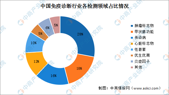 根據(jù)中商產(chǎn)業(yè)研究院統(tǒng)計,從免疫診斷行業(yè)各個細分市場來看,腫瘤標志物檢測、甲狀腺功能檢測和傳染病檢測是我國免疫診斷項目中,規(guī)模排名前三的領域。其中腫瘤標志物檢測項目市場最大,占比達到28%。