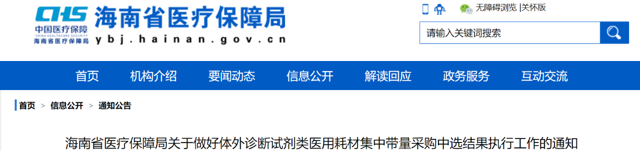 11月26日,海南醫(yī)保局發(fā)布《關(guān)于做好體外診斷試劑類醫(yī)用耗材集中帶量采購中選結(jié)果執(zhí)行工作的通知》(簡稱《通知》)。