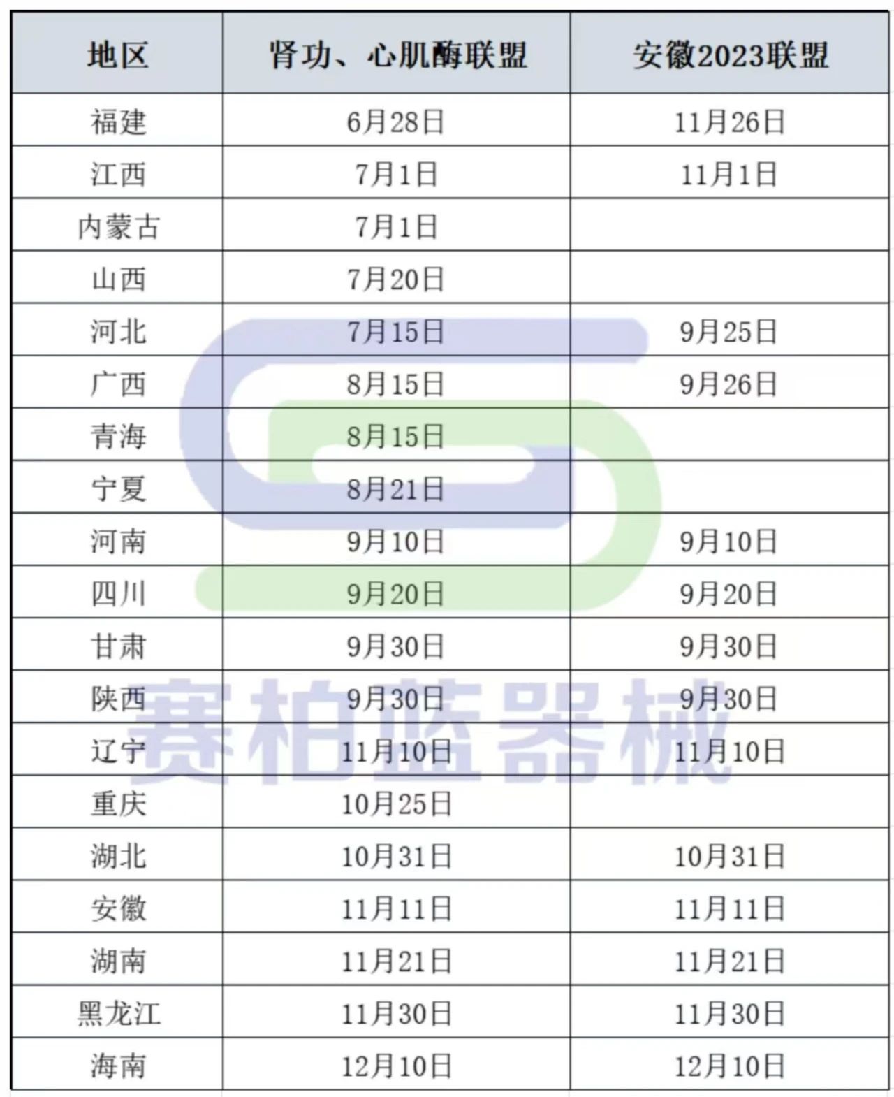 截至目前,全國多地已明確上述聯(lián)盟集采的執(zhí)行時間,其中肝功生化集采已全面落地完成,腎功心肌酶聯(lián)盟與安徽2023聯(lián)盟集采的進(jìn)度如下: