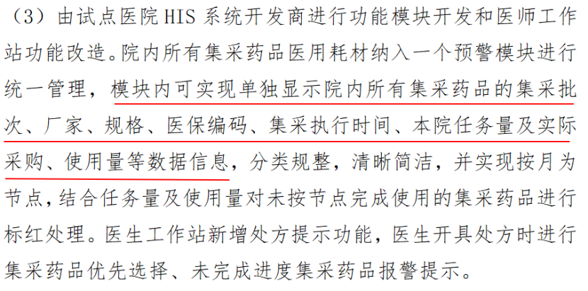 其中提出,探索開展二級及以上公立醫(yī)療機構(gòu)建設(shè)院內(nèi)集采預(yù)警系統(tǒng)試點,通過整合醫(yī)院庫房管理系統(tǒng)、醫(yī)療HIS系統(tǒng)、處方系統(tǒng)等多個系統(tǒng)的數(shù)據(jù)和功能,將所有集采藥品醫(yī)用耗材納入一個預(yù)警模塊進(jìn)行統(tǒng)一管理,增加集采產(chǎn)品使用情況報警提示功能,加強集采產(chǎn)品使用監(jiān)管。