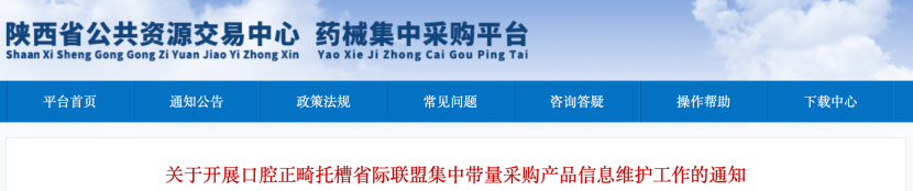 8月22日,陜西公共資源交易中心發(fā)布《關(guān)于開(kāi)展口腔正畸托槽省際聯(lián)盟集中帶量采購(gòu)產(chǎn)品信息維護(hù)工作的通知》。