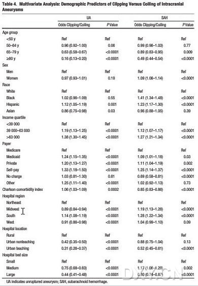 研究結(jié)果表明:當(dāng)對比進(jìn)行SAH治療的患者時發(fā)現(xiàn),進(jìn)行未破裂顱內(nèi)動脈瘤治療者女性居多(75.0% 對比69.0%; P<0.0001)??偟模?.7%接受SAH治療的是自費(fèi)患者,而3%進(jìn)行未破裂動脈瘤治療的是自費(fèi)患者(P<0.0001);62.2%接受SAH治療的是白種人,而76.4%進(jìn)行未破裂顱內(nèi)動脈瘤治療的是白種人(P<0.0001);黑人、拉美裔和亞洲患者在接受SAH治療組中所占比例較高,相對而言,在未破裂顱內(nèi)動脈瘤治療組中所占比例較低(他們的P<0.0001)