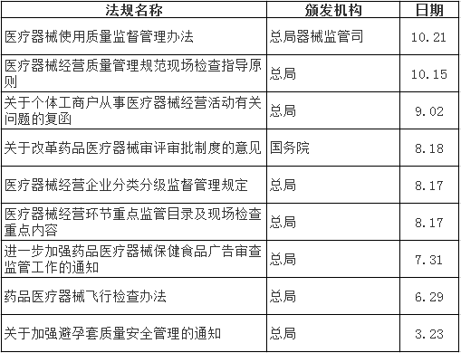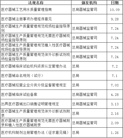 2014年-2015年,在行業(yè)母法國務院《醫(yī)療器械監(jiān)督管理條件》歷經(jīng)10年修改終于落地的背景下,CFDA在醫(yī)療器械監(jiān)管上先后出臺了多項政策。據(jù)不完全統(tǒng)計,2015年1月以來,由總局及醫(yī)療器械監(jiān)管司出臺的醫(yī)療器械政策征求意見稿至少有14項,由國務院及總局出臺的醫(yī)療器械法規(guī)、部門規(guī)章和規(guī)范范性文件,多達20余項,比較重要的有9項。