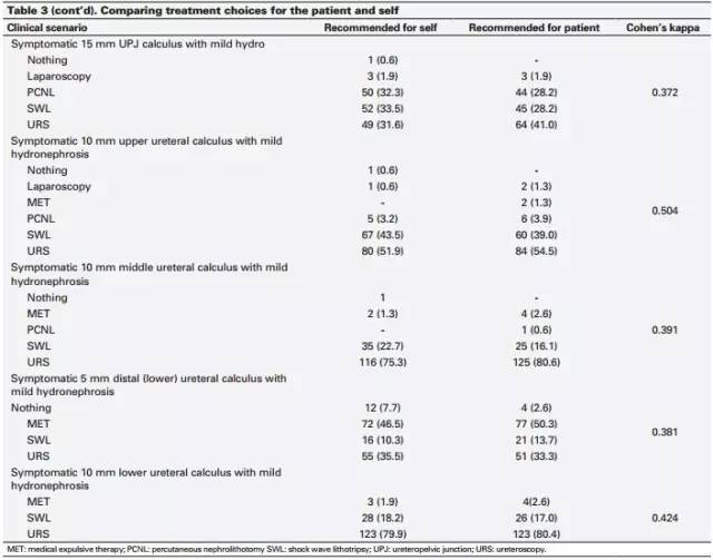 來自38個(gè)國家的泌尿外科醫(yī)師對兩項(xiàng)調(diào)查問卷的回復(fù)率分別為78%(160/205)和84%(172/205)。受訪者的平均手術(shù)經(jīng)驗(yàn)時(shí)限為7年(2-30)。共有117(75%)名泌尿外科醫(yī)生為教學(xué)醫(yī)院的醫(yī)生。盡管泌尿外科醫(yī)生向患者推薦的治療方案與假想自己為患者時(shí)所推薦進(jìn)行的治療方案并不完全吻合。但整體而言,無論是針對自己還是患者,體外碎石與輸尿管鏡(URS)技術(shù)都是最受推崇的方案;藥物排石(MET)與腹腔鏡手術(shù)是推薦最少的方案。