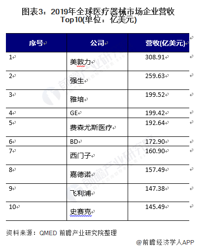 從全球醫(yī)療器械分布領(lǐng)域及行業(yè)巨頭的布局來看,企業(yè)集中度較高,其中,美敦力以308.91億美元的營收位居榜首,連續(xù)四年保持全球醫(yī)療器械霸主地位。