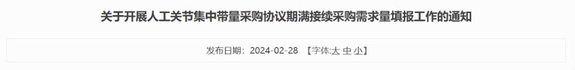 今日(2月28日),上海、山西、內(nèi)蒙古等多地發(fā)布《關(guān)于開(kāi)展人工關(guān)節(jié)集中帶量采購(gòu)協(xié)議期滿(mǎn)接續(xù)采購(gòu)需求量填報(bào)工作的通知》。