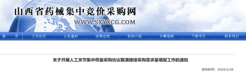 全國(guó)多地啟動(dòng)人工關(guān)節(jié)接續(xù)采購(gòu)需求量填報(bào)。