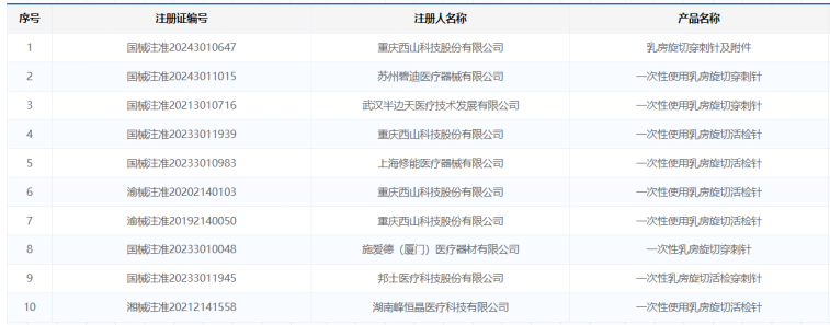 乳房旋切針相關(guān)獲批企業(yè)見下表: