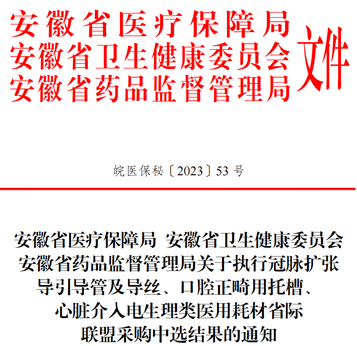 近日,安徽省醫(yī)保局、省衛(wèi)健委、省藥監(jiān)局三部門(mén)聯(lián)合發(fā)布“關(guān)于執(zhí)行冠脈擴(kuò)張導(dǎo)引導(dǎo)管及導(dǎo)絲、口腔正畸用托槽、心臟介入電生理類(lèi)醫(yī)用耗材省際聯(lián)盟采購(gòu)中選結(jié)果的通知”。