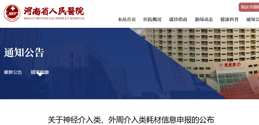 近日,河南省人民醫(yī)院官網(wǎng)發(fā)布《關(guān)于神經(jīng)介入類、外周介入類耗材信息申報的公布》,醫(yī)療機(jī)構(gòu)將根據(jù)產(chǎn)品申報信息進(jìn)行相關(guān)采購數(shù)據(jù)填報。