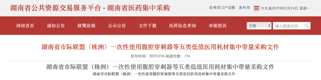 2月24日,湖南省公共資源交易平臺發(fā)布《關(guān)于公布湖南省市際聯(lián)盟(株洲)次性使用腹腔穿刺器等五類低值醫(yī)用耗材集中帶量采購文件的通知》,開展一次性使用腹腔穿刺器、壓力傳感器、一次性使用靜脈留置針、一次性使用腰硬聯(lián)合麻醉穿刺包、醫(yī)用膠片集中帶量采購工作。