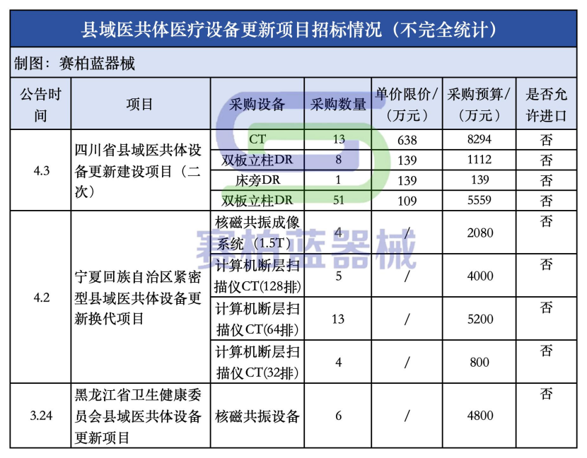 其中,四川省縣域醫(yī)共體設(shè)備更新建設(shè)項目此輪采購CT、DR共73臺,預(yù)算金額約1.5億元。寧夏回族自治區(qū)緊密型縣域醫(yī)共體設(shè)備更新?lián)Q代項目此輪采購CT、核磁共26臺,預(yù)算金額約1.2億元。黑龍江省衛(wèi)生健康委員會縣域醫(yī)共體設(shè)備更新項目此輪采購核磁6臺,預(yù)算金額4800萬元。