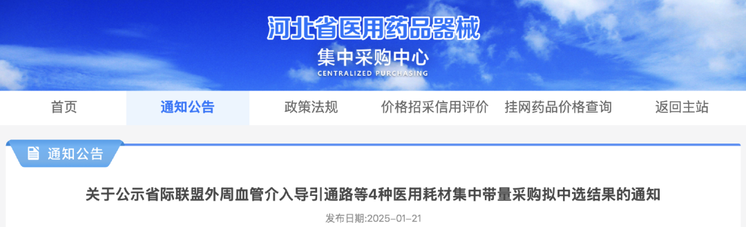 1月21日,河北省醫(yī)用藥品器械集中采購中心發(fā)布《關(guān)于公示省際聯(lián)盟外周血管介入導(dǎo)引通路等4種醫(yī)用耗材集中帶量采購擬中選結(jié)果的通知》,公示時(shí)間為2025年1月22日至2025年1月27日。