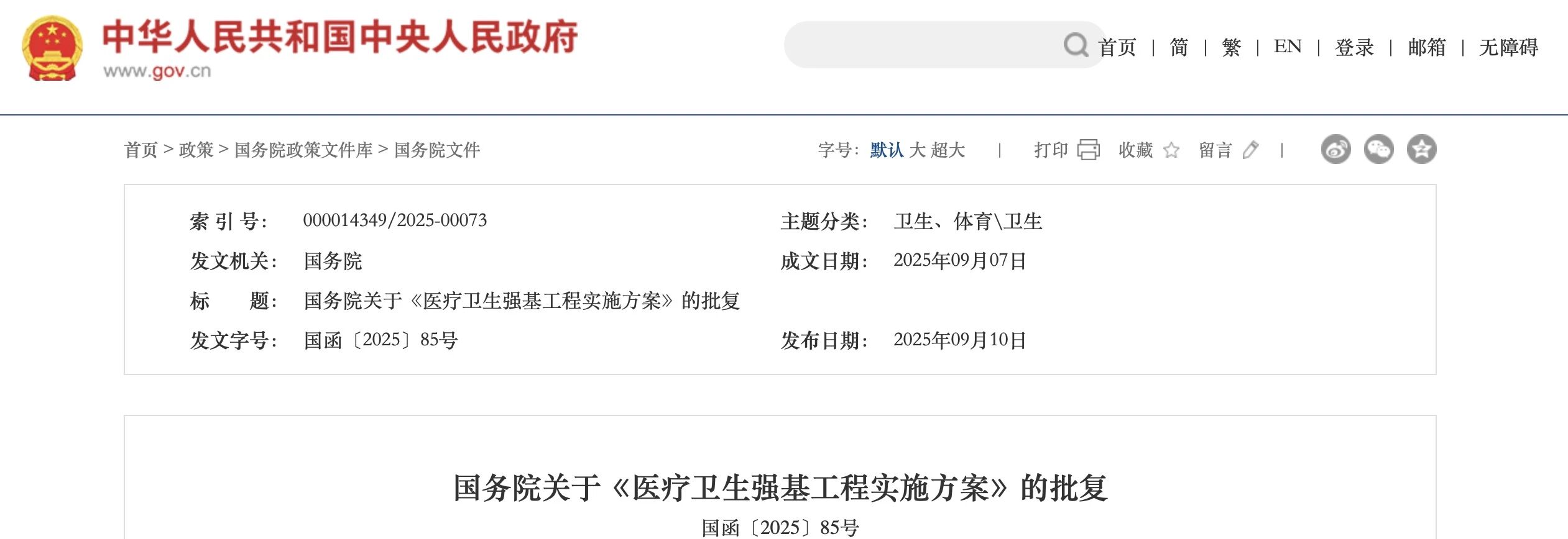 9月10日,據(jù)中國政府網(wǎng)消息,國務(wù)院批復(fù)同意《醫(yī)療衛(wèi)生強(qiáng)基工程實施方案》(簡稱《實施方案》),并附上方案全文。