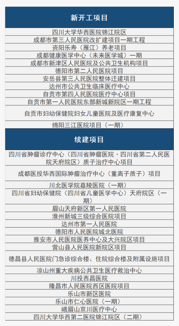 日前,四川省發(fā)改委公布2021年度重點項目名單,其中新開工、續(xù)建醫(yī)療項目名單如下: