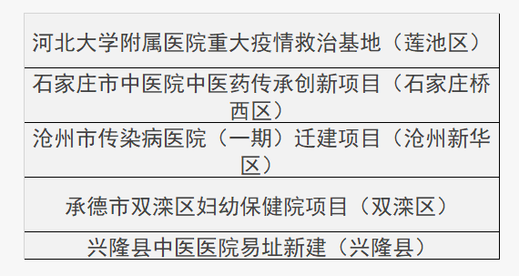 根據(jù)《河北省2021年省重點建設(shè)項目名單》,共安排省重點項目682項,總投資11896.5億元,年度預(yù)計投資2810.6億元其中,新開工項目中含醫(yī)療衛(wèi)生項目5項,分別是: