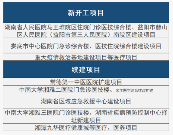 2021年湖南省重點建設(shè)項目已公布,其中醫(yī)療相關(guān)新開工項目以及續(xù)建項目包含: