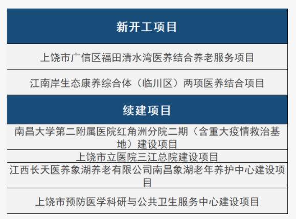 續(xù)建項目里含醫(yī)療衛(wèi)生項目11項、醫(yī)養(yǎng)結(jié)合項目2項,分別是: