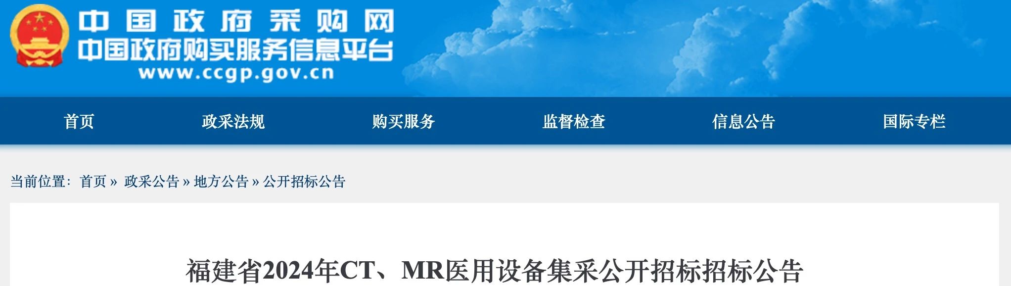 近日,中國政府采購網(wǎng)發(fā)布《福建省2024年CT、MR醫(yī)用設備集采公開招標招標公告》(簡稱《公告》),預算總計8.97億元人民幣,總數(shù)量達92臺。