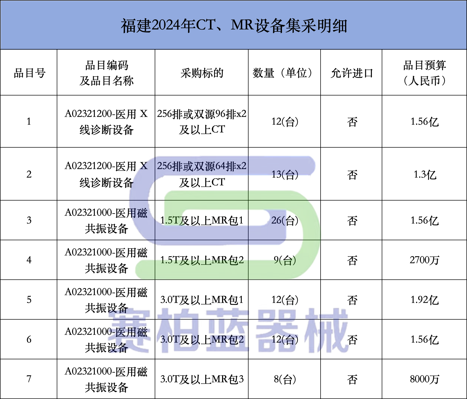 根據(jù)公告,此次福建設備集采共分7個采購包,分別為256排及以上CT包1、256排及以上CT包2、1.5T及以上MR包1、1.5T及以上MR包2、3.0T及以上MR包1、3.0T及以上MR包2、3.0T及以上MR包3,各自的詳細如下: