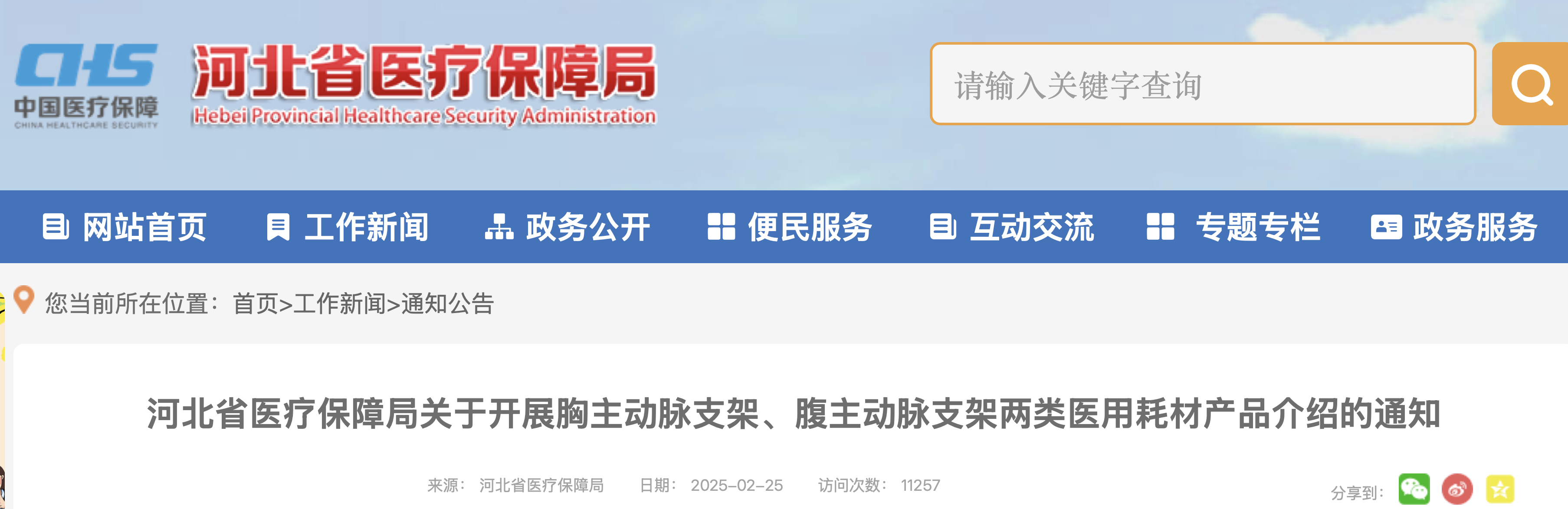 2月25日,河北醫(yī)保局發(fā)布《關于開展胸主動脈支架、腹主動脈支架兩類醫(yī)用耗材產(chǎn)品介紹的通知》(簡稱《通知》)。